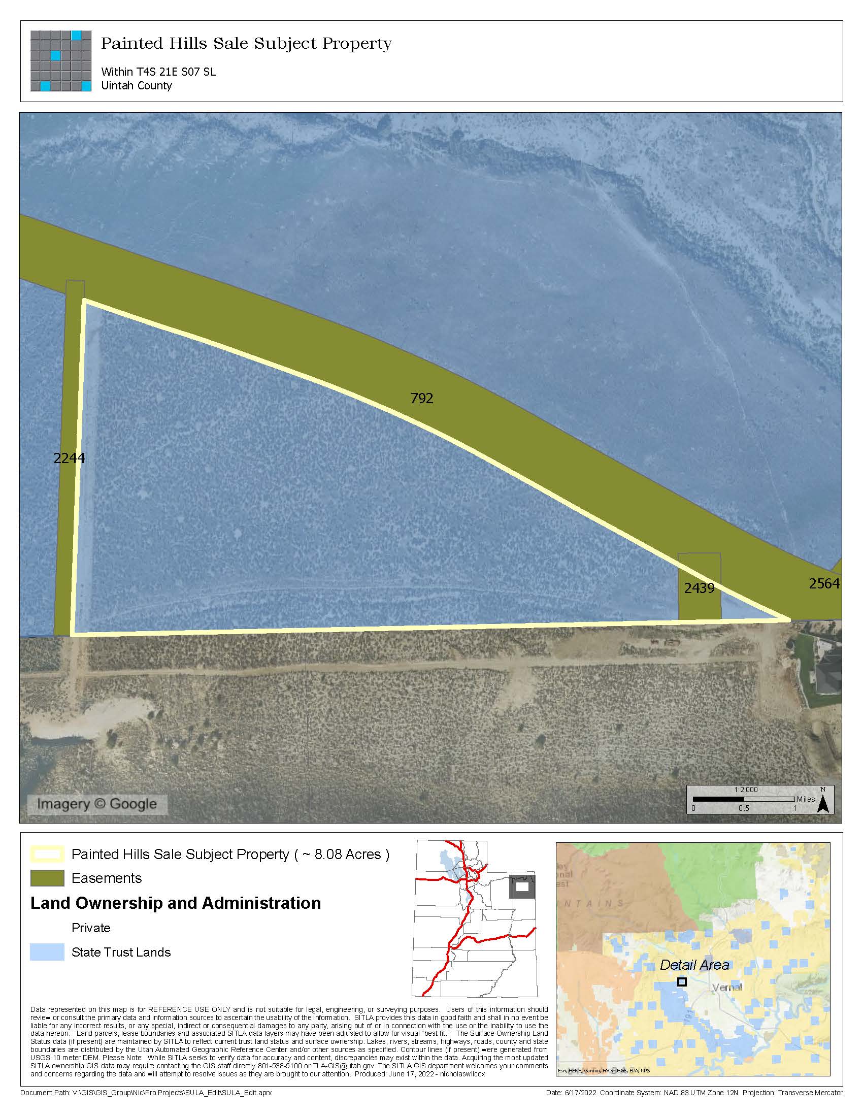 LAND FOR SALE AT PUBLIC AUCTION: Utah School and Institutional Trust Lands Administration is selling a 9.63 acre property at a public online auction to be held November 9-15, 2022. The property is triangle shaped, with flat terrain and mostly sage brush type vegetation. The parcel is located east of the Painted Hills Subdivision on 1500 North in Maeser - which is near Vernal, Utah. The minimum acceptable price is set at $125,000.00. Financing is available.