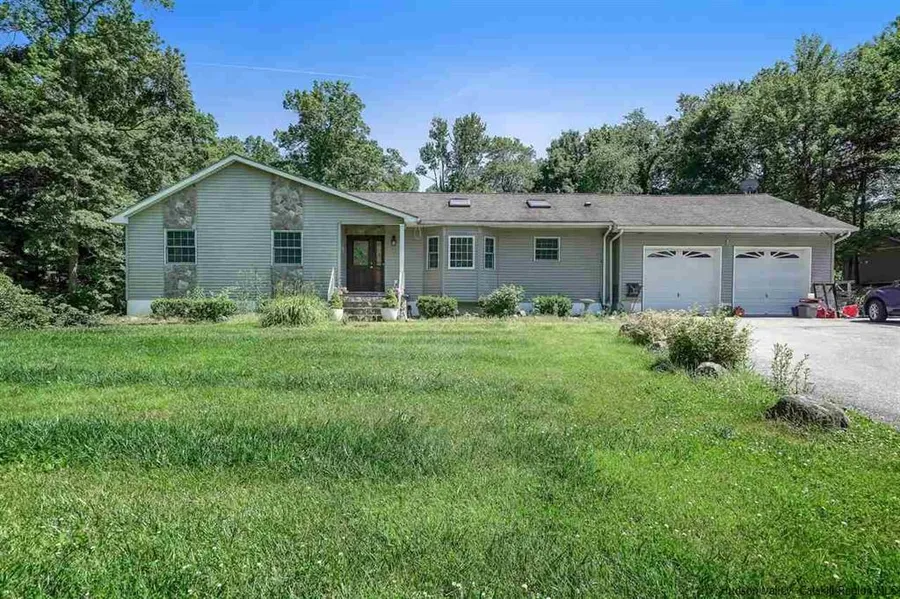 Set back on a private lot, you'll love this spacious ranch! This 3 bed 2 bath single story home offer vaulted ceilings with sky-lights, and large windows making the living spaces full of light. Beautiful stone fireplace accents the living-room for cozy winters! The eat in kitchen has wood cabinetry and breakfast bar. You'll appreciate the large mud/laundry room right off the kitchen, keeping messes contained. Need more space? Head downstairs to the full basement, great for storage or play! 1.5 flat acres surround this home, with a large deck for outside living. Solar panels complete this one story house, and make for easy living!