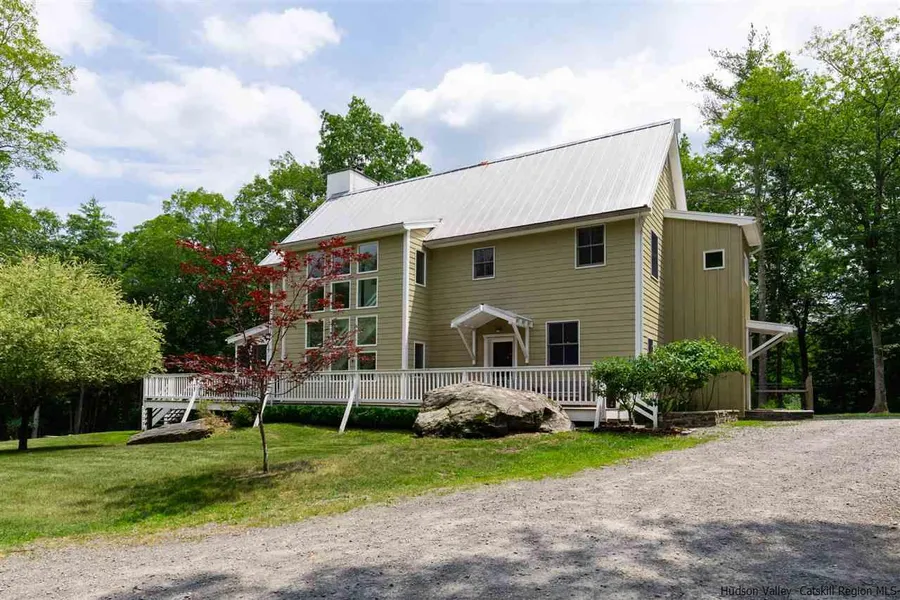 Perched on a ridge in the Bluestone Wild Forest outside Woodstock, sits this majestic modern and airy barn-style home. This 3 Bdr, 2 bath home is ideally suited for those interested in maximum entertaining in style, and grace. Sit and congregate by the grand floor to ceiling stone fireplace in the living room or relax after skiing by the ultra- modern Belgian woodstove in the den. If thats not enough fire option for you, this home has a gorgeous outdoor fireplace in the screened in porch. Then theres always the firepit outside for warm summer nights! Downstairs the barn is an open, lofted living room with cozy sitting area. The wide- open floor plan allows you to prepare dinner in the fully equipped chefs kitchen with Kenmore Pro stove and oven with no separation from friends or family. Powder room is off the kitchen and down a hallway for convenience. Upstairs, the master bedroom is complete with an en-suite bathroom- deep-soaking tub, separate shower and on other side of bedroom is a huge walk in closet. And all the light throughout the home is amazing!! The upstairs landing has a large well-appointed reading area and tons of shelves for storage or display. Outside a large wrap-around deck offers views of the sweeping lawn, wild forest, and a running creek down the ridge. Glass doors off the living room connect you to a wrap- around deck to enjoy some afternoon sunshine. Other features include central air controlled by a two zone Nest thermostat. This house is just 10 minutes from the village of Woodstock, 10 minutes to Kingstons Uptown area (now dubbed a foodie destination) and 15 minutes to Rhinebeck and the Rhinecliff Amtrak station.