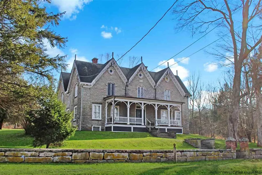 Let's face it. This damn virus has changed everything. While we all search for a new sense of 'normal', many are thinking it's time for the country retreat. A safe place to escape to and recharge. The Stone Ridge area is about as good as it gets. This gorgeous landmark is known as the Oliver House and as the House of Seven Gables by the locals. This one of a kind unique structure, with almost 5,000 square feet, will intrigue you. Available for the first time in 50 years. The original section of the home is thought to date to the late 1600's. The various additions were added in the Gothic Revival era of the early 1800's and a local prominent family known as the Oliver's created the present day masterpiece. The present stone house structure has stood thru it all and if those old walls could talk we'd hear quite a tale. Standing strong and proud and surrounded by the well known Farm Hub. Spend some time and take it all in. Gorgeous stone and wood work thru out. Huge chestnut beams and white oak boards support the structure. The exterior is all local milled limestone and the seven gables are quite pleasing to the eye. Marble fireplaces once provided the heat here. The present day main floor wraps around the original late 1600's section and contains a beautiful kitchen with a full bath off of it. There is also a formal dining room, parlor room, bar room and a half bath. It's best thought of as a center hall Colonial I'd say and a wide stair case takes you to the second floor where you'll find four large bedrooms, a full bath and an area perfect to be an office. Large walk in closets in the bedrooms are unheard of in this vintage as are the high ceilings throughout the home. The attic is massive and offers a way out to the widows walk. One oil fired furnace provides forced hot air heat for the main floor and a second in the attic fueled by propane provides forced hot air and a/c for the second floor.