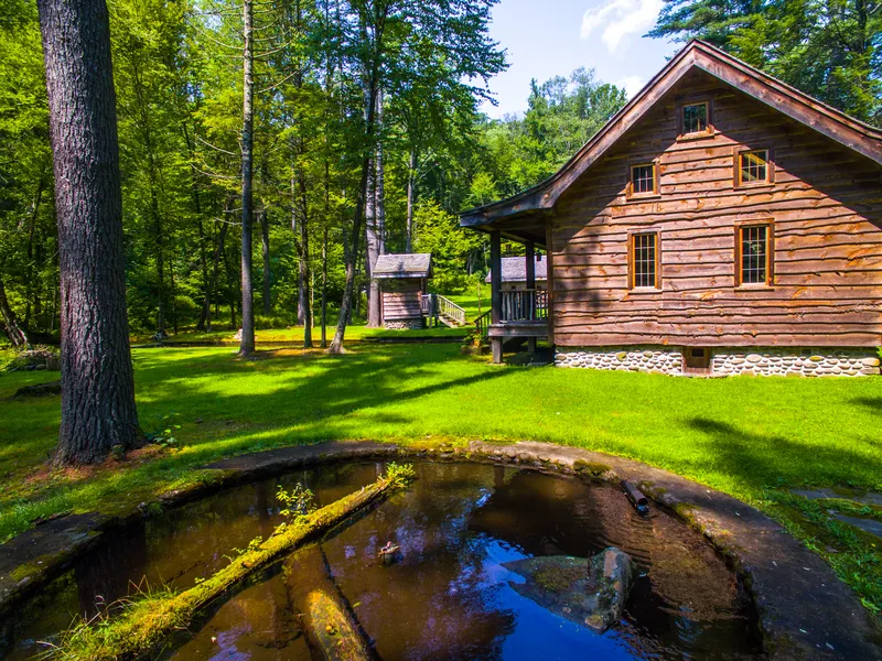 Tolkien Forest Wonderland on the Vernooy Kill in Napanoch. Access can be from Lundy Rd or from Upper Jenny Brook Rd. This Adirondack style lodge with hints of Japanese architecture is a simple but elegant gentleman's get-away camp set in a mature forest nestled within a bed of moss, ferns and giant rhododendron surrounded by an historic trout hatchery with a dozen pools. Enter this remarkable estate through a primordial forest curated as an artisanal wilderness retreat. The eventual buyer will know immediately and fall in love with this unique property. The hand built custom lodge with a Japanese motif roof-line is highlighted by a massive stone fireplace with two hearths. One of the fireplaces charms the indoors and the other dominates the large screened summer living room. The cathedral ceiling home has wrought iron bars reinforcing the structure, selected barnwood is used for the interior walls and floors give an ambiance of warmth and comfort for peace filled time when on retreat within the massive centenarian forest. Architectural details include blacksmith door and structural hardware, clear cedar trim around windows, lead plate caps on deck posts, copper flashing around the chimney, thick cedar shake shingles, Adirondack style thick slab-wood siding, heavy insulation and it is all surrounded by 30" to 48" diameter OLD TREES -- think of an enchanted friendly forest. A craftsman built utility garage houses the tools and equipment used to maintain the grounds of the estate. There is no interference from electronic media in this off-the-grid escape as you will be surrounded only by the pristine sounds of the streams and wind through the branches. A half mile of the renowned Vernooy Kill, a world class trout river, runs through the property and adjoins additional miles of the stream within thousands of acres of NY State Forever Wild Forest around three sides. Meander along the paths among the arboreal grandeur of the uncut forest and along the river and streams that feed the ponds and pools. The estate is a portion of the historic, but now gone, Yama Farms Resort Hotel. It was frequented by the rich and famous during the early 1900's with familiar names such as Roosevelt, Ford, Firestone, Cody, Burroughs, Te Ata Fisher, and Chase. As a portion of the Yama Farms, this stream filled wonderland once produced thousands of brook trout for restaurants around the northeast. The pure water of its streams was recently considered as a primary source for a renowned water bottling company. See the aerial video at this link: Less than two hours from NY City, but make no mistake as this location is isolated. Plan on coming here to relax in rustic comfort with the simplest though elegant accommodations and meditate among giant rhododendrons and a cathedral of forest.