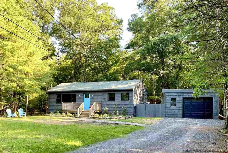 VERY CHARMING AND DIALED IN... this freshly and fully renovated cottage sits in the tranquil woods 2 miles from the bustling center of Woodstock. 2 bedrooms + an additional room which would be perfect for an office or a third bedroom with bunk beds. Working from home has never looked better! Open concept living /dining with vaulted ceilings. Mini splits in every room and closed cell insulation keep this house the perfect temperature all year round. Detached oversized garage with new garage door and an additional shed connected on the back would make for a great art studio, potting shed or chicken coop. Expansion opportunity with the garage also. The back yard is lovely and serene with Adirondack chairs around a firepit...and a hammock is at the ready for some chill R 'n R. It is entirely fenced in and ready for all your furry 4 legged friends to play. The house is MOVE IN READY and being sold partially furnished with a well curated selection of antique furniture maximizing storage and giving this space a very unique look and feel. NEW: Septic, electrical, plumbing, windows, hot water heater and all appliances.