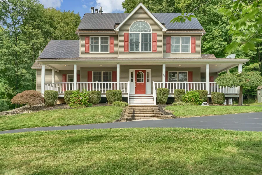 Nestled on a private Cul-de-sac sits this beautiful contemporary Colonial on 2.5 private acres. Recently renovated kitchen with granite and stainless appliances, pantry, and contemporary country finishes. Kitchen open to living room with natural fireplace. There is a large first floor master bedroom with walk in closet, and with dedicated master bath with soaking/whirlpool tub. The second floor has a sitting room with large palladium window, 2 bedrooms with Jack & Jill bath and an office or possible 4th bedroom. Relax on the expansive front porch and welcome guest as they arrive up the circular driveway. The rear deck overlooks a the large back yard which is lined with trees for privacy. The backyard is suitable for a nice pool and the environmentally friendly solar panels enable significant utility cost reductions. Finally the basement has been finished providing an additional 800 SF of living, office, or play room space for the kids. This is well built, well maintained, and well located. A must see!