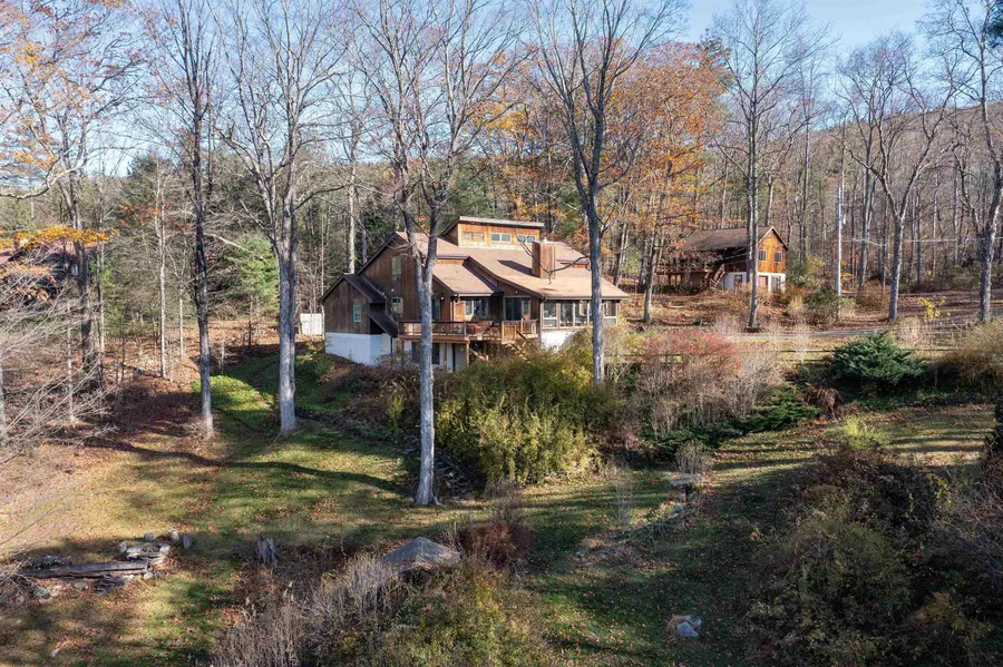 WELCOME TO THE PRIVACY LOCATION AND VIEW YOU'VE BEEN WAITING FOR...This compound ready property has been developed with artful intention on 8.97 acres. This first time on the market 3 bedroom 2.5 bath home with 1 bedroom casita was built with love, quality and efficiency. A long driveway opens to reveal captivating landscaping, multilevel lawns, stonewall tiered gardens, slate walking paths and a small pond. Each structure is perfectly placed on the land to maximize the view and privacy. The main house is a custom built cedar sided light bright open Contemporary with a Danish Mod flare. The first floors luxurious sunroom has slate flooring and expansive windows offering stunning views of the surrounding property. The entryway opens into spacious living room with an impressive 2 story fire place, hardwood floors throughout, and vaulted cedar plank ceiling. The kitchen has solid oak cabinetry handcrafted by a local artisan, excessive storage and a center island and access to the attached 2 car garage. The dining room has coordinating oak cabinetry and a large slider giving access to an expansive wrap around second story deck overlooking the woods, meadows and mountains. A private primary bedroom with ensuite bathroom and walk in closet rounds out the amazing first floor. A floating oak staircase with landing leads to a loft, 2 bedrooms each with impressive walk in storage and shared full bath. The lower level, complete with laundry room, wood stove, and an exit/entrance to a stone path leading to lower garden and pond, could make for the perfect home office, play room, den or guest room. Attached two car garage with storage and separate outdoor parking. AND THERE'S MORE! This legal multi-family dwelling features a separate circular drive and parking for the exclusive use of a 1 BDRM 1 BATH cedar sided guest/passive income apartment atop a two car garage. Enter through the mudroom and immediately captured by the view through the expansive windows. The full sized kitchen is complete with pantry handcrafted cabinets, opens to a living room/dining room and slider that opens to from dining area to a large second-floor deck to enjoy the view. An abundance of closets in each room and a pull-down ladder for additional attic storage. The garage space below is currently configured with an over sized single-garage with floor to ceiling shelving and separate wood shop/workshop on the other side.