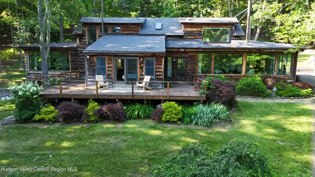 The house with its distinctive and rustic rough cut wood sided exterior is juxtaposed with sleek modern lines once inside. A bright and airy living room overlooks the pool to one side and the glorious greenery of the trees with a seasonal mountain view on the other through large picture windows that bathe the room in natural light. The well equipped kitchen is fit for entertaining for one or one hundred with an island and plenty of prep space and storage. It opens up to an inviting dining area with lots of windows for sunny morning coffee and a propane fireplace for cozy intimate dinners by the fire. A primary suite is tucked off to one side and shares the same view as the living room. Sliding glass doors lead to a generously sized deck, a great spot from which to read a book or watch the fireflies. From the living room toward the rear yard there is a flex room which could be used for a number of purposes - extra guest room, office, TV room, yoga or meditation room. Upstairs are two large bedrooms, one of which enjoys year round mountain views and a shared bath. The in-ground heated pool is saline with an outdoor kitchen area. Large enough for pool parties, private enough for skinny dipping. The land slopes up behind the house and there is a level area that had previously been prepped for a tennis court if one wishes, and above that are solar panels which cover half or more of the electric needs for the property. Last February's electric bill which included heat, hot water and lights was only 226.00. Newer mini splits are the primary source for heat and cooling. There is a partial basement offering plenty of easily accessible dry storage. The seller acquired an additional 40+ acres adjoining their original parcel over the years to ensure that the character of the area would be preserved and protected from overdevelopment. This rare large parcel provides undisturbed and pristine woodlands for privacy and enjoyment of nature only 5 minutes to town. Cooper Lake Road is one of the most beautiful spots in Ulster County and a coveted address in Woodstock. Only minutes from the Bearsville complex with music, food, drinks and theatre events, and Cub Market around the corner. Woodstock and the surrounding communities are home to a wonderful eclectic mix of shops, galleries, restaurants, theatre, flea markets , farm stands and weekly farmers' markets. Enjoy the Hudson Valley lifestyle offering the peaceful quality of life you crave within 2 hours of NYC