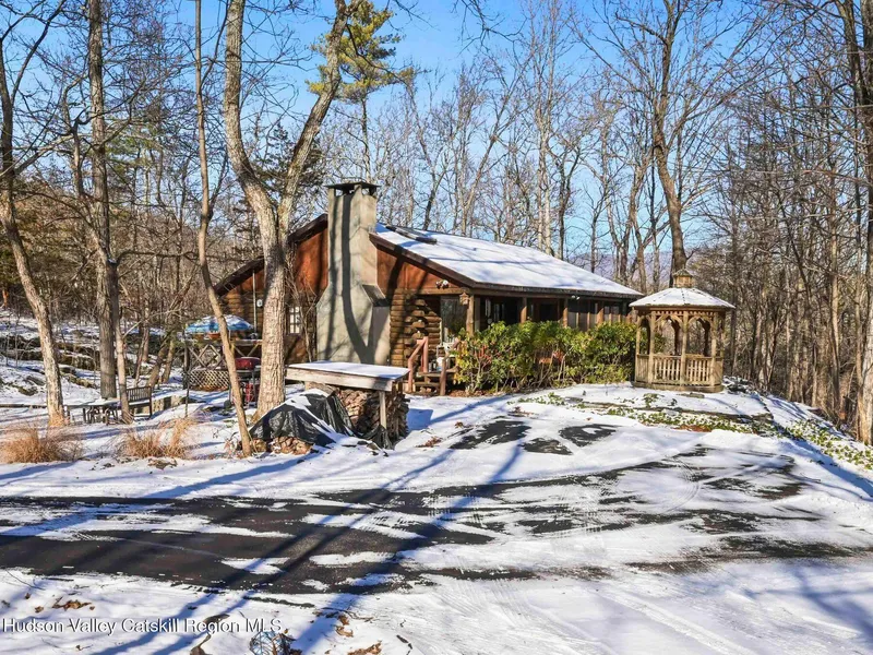 Discover the perfect Catskill retreat in this charming, authentic log cabin Maverick home, nestled in the tranquil woods of West Hurley. Just minutes from the artistic and historic hub of Woodstock and only two hours from New York City, this meticulously maintained home offers a rare combination of privacy, natural beauty, and timeless craftsmanship. Tucked away from the road on a gently sloping wooded landscape, the property features an open-air deck, a cozy screened porch, and a nearby gazebo, all with serene views of the surrounding forest. A picturesque stone patio and pond complete the outdoor spaces, creating a peaceful haven to relax and recharge.