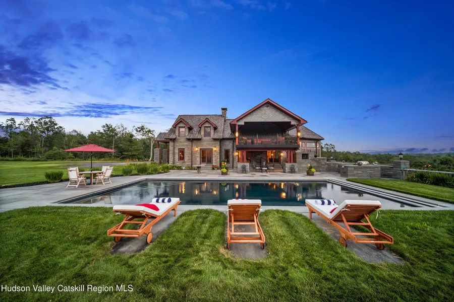 Welcome to the Castle in the Sky-a truly unique architectural masterpiece nestled in the heart of the Hudson Valley. This extraordinary estate offers 5,000 square feet of refined interior living space and expands to over 11,000 square feet when including the outdoor living areas, covered terraces, balconies, barn, and workshop. A harmonious blend of modern sophistication and timeless elegance, this property stands as a testament to meticulous craftsmanship and enduring artistry. Perched on more than 46 private acres, this secluded retreat commands breathtaking views of Mohonk Mountain and the Catskills. The estate seamlessly integrates luxury, nature, and adventure, creating an unparalleled living experience. Inside, soaring vaulted ceilings adorned with massive timber beams-harvested directly from the land-create a warm yet majestic ambiance. Expansive windows frame stunning vistas, while wide-plank radiant-heated floors and a custom double-sided stone fireplace combine comfort with elegance. The residence features five spacious bedrooms and four and a half luxurious bathrooms, all showcasing impeccable craftsmanship. The two-story great room, a sophisticated dining area with bay window views, and a gourmet kitchen designed for entertaining highlight the home's exceptional character. Adding to its uniqueness, two enchanting castle turrets house spiral staircases leading to elevated observation decks, offering panoramic views of the Hudson Valley. A 200-foot illuminated underground bluestone tunnel connects the main residence to a separate 4,000-square-foot barn. Fully equipped with electricity, water, and radiant heat, the barn offers limitless possibilities-whether for showcasing high-end collector cars, establishing a tranquil yoga studio, or creating your dream space. The estate's thoughtful design extends to its enchanting outdoor living areas. Each covered terrace and balcony incorporates advanced water-capturing and rerouting systems, ensuring dry and comfortable spaces year-round. Sliding doors lead to an expansive bluestone terrace featuring a heated Diamond Bright Gunite pool and a luxurious outdoor kitchen-ideal for entertaining or relaxing. Nearby, a bluestone spa and a man-made pond designed for swimming and fishing enhance this private sanctuary's allure. Originally built in 1994, this estate is the culmination of over a decade of intentional design and expert craftsmanship. Every element-from its stately facade to its serene surroundings-reflects an unwavering commitment to excellence. The Castle in the Sky is more than a home-it's a legacy, a lifestyle, and an invitation to live surrounded by elegance, tranquility, and wonder.