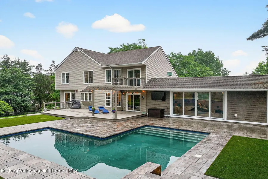 Pride of ownership radiates from every corner of this beautifully maintained and spacious contemporary home, perched atop a circular driveway on a quiet cul-de-sac in one of Kingston's most desirable neighborhoods. Located just 90 miles from NYC and minutes from the vibrant Stockade District, this property offers the perfect blend of luxury, privacy, and convenience. Spanning 3,770 sq feet, the home welcomes you with a grand foyer, high ceilings, and an abundance of natural light that fills the open layout-ideal for both entertaining and everyday living. To the right of the staircase, you'll find a cozy living room accented with a gas fireplace that seamlessly flows into the formal dining room. From there, step into the heart of the home: the kitchen and adjoining sitting area, which overlook the stunning heated gunite in-ground pool. Surrounded by a stamped concrete patio and a beautiful deck, this backyard oasis makes every day feel like a private retreat. The kitchen features stainless steel appliances, quartz countertops, a tile backsplash, ample cabinetry, and an oversized breakfast bar with plenty of space for cooking and entertaining. Just off the kitchen is a spacious family room, perfect for gatherings, complete with a convenient half bath. A generously sized primary suite is located on the first floor, offering a modern bathroom and ample closet space, with a washer and dryer conveniently located just outside the hallway-making single-level living easy and efficient. In addition, there is a half bath on the main level for guests. Upstairs, you'll find three additional bedrooms, including a second primary suite with a beautifully updated bathroom, modern vanity, spacious walk-in closet, and a private balcony-perfect for enjoying your morning coffee and the peaceful sounds of the backyard waterfall. The remaining bedrooms are generously sized with ample closet space, and there is also a dedicated office with pull-down attic access for additional storage, plus a second full bathroom on this level. The lower level is currently set up as a game room and gym, with indoor/outdoor access that leads to the oversized two-car garage, plus an additional third garage bay-ideal for storing all your seasonal toys and equipment. Conveniently located just minutes from the NYS Thruway, Trailways bus station, and all the best Upstate attractions, farmer's markets, and events. This is more than a home-it's an extraordinary lifestyle opportunity. Don't miss your chance to make it your own!