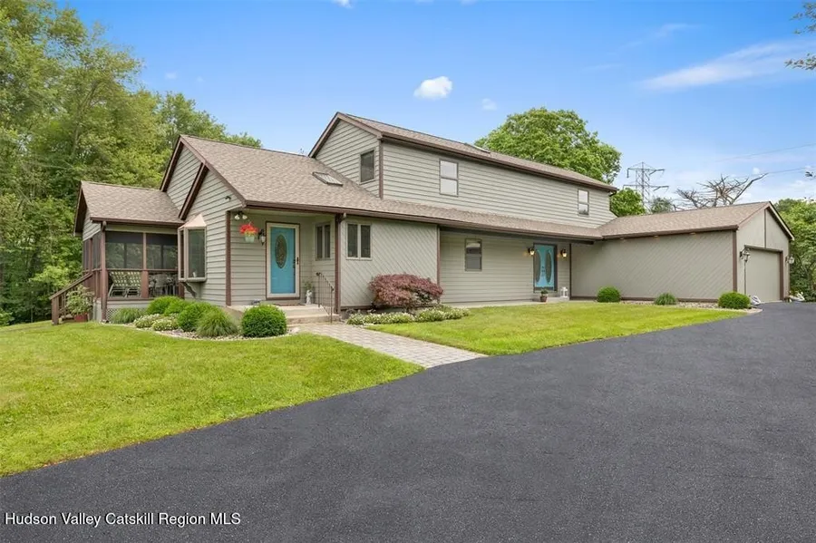 Tucked away yet just minutes from the heart of New Paltz, this 3-bedroom, 2.5-bathroom custom-built contemporary sits on 3.9 lush acres and delivers the ultimate live, work, and play lifestyle-with a private in-ground pool, tranquil pond, and breathtaking Shawangunk Mountain views as your everyday backdrop. Just a short drive from the vibrant village center, you'll find everything that makes New Paltz one of the Hudson Valley's most beloved destinations-farm-to-table dining, independent shops, weekly farmer's markets, live music, art galleries, and miles of protected trails. Whether you're spending your morning hiking the Mohonk Preserve, grabbing lunch on Main Street, or working remotely from your screened-in porch, this home supports the full rhythm of life here. From the curved driveway and manicured grounds to the soaring ceilings and sun-soaked interiors, every detail reflects pride of ownership and timeless craftsmanship. The open-concept main level flows effortlessly from the formal living and dining areas into a thoughtfully renovated kitchen, where granite countertops, custom cabinetry, and an oversized picture window frame postcard-worthy views of the mountains and water. Step out to your screened-in porch, then head poolside for a swim or settle by the pond with a fountain, watching wildlife as the sun sets behind the ridge. The first-floor primary suite offers privacy and comfort, while an adjacent home office makes remote work a breeze. Upstairs, two spacious bedrooms and a full bath are connected by a loft-style balcony, offering light, space, and more incredible views. Whether you're looking to unwind, entertain, or create a sanctuary for your next chapter, this home delivers a rare blend of elegance, functionality, and the raw natural beauty that defines the Hudson Valley. Only 90 minutes from NYC, yet a world away.