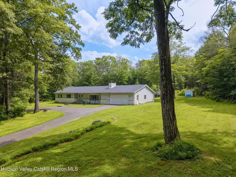 Welcome to your private country haven in the heart of Stone Ridge. Nestled on over 5 serene acres along a quiet country road, this beautifully maintained ranch-style home offers the perfect blend of comfort, space, and style, all within the desirable Rondout Valley School District. As you step inside you will feel immediately at home. The inviting entry foyer opens into more than 2,000 square feet of warm and thoughtfully designed living space, including 3 generously sized bedrooms, 2 full baths, and a layout ideal for both relaxed living and stylish entertaining. The dramatic sunken living room is the heart of the home, complete with a stunning Vermont-style stone fireplace that adds rustic charm and a cozy ambiance. The updated kitchen flows seamlessly into a formal dining room, while a separate office provides the perfect space for remote work or creative pursuits. Black walnut hardwood floors, skylights, and ample natural light throughout lend elegance and warmth to every room. Enjoy peace of mind with a newer roof, solar panels for energy efficiency, and a 2-car attached garage. Outside, unwind by your above-ground pool, or explore the expansive yard ideal for gardening, gatherings, or simply soaking in the beauty of your natural surroundings. This home offers one level living in a tranquil lifestyle setting yet convenient location which checks all of the boxes. Don't miss out on this wonderful opportunity.