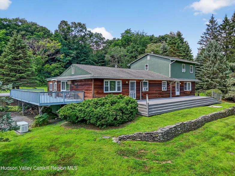 Major space meets major opportunity: This versatile 2-family home nestled on 2 sunny acres offers privacy plus big potential for comfortable living and extra income. Perfectly adaptable, you can rent both units, live in one while renting the other, or knock down a wall to create a spacious single-family residence. The first unit is an extra roomy, one-level home featuring three bedrooms and two full baths. It boasts a large open living and dining room, an additional family room, a multi-roomed basement ideal for storage, a screened porch, 2-car garage, and, best of all, expansive wraparound decks - perfect for outdoor entertaining and enjoying the serene surroundings. The adjoining second unit is a charming townhouse-style residence with a full bath, living and dining rooms on the main level, a covered deck area, and two bedrooms with a second full bath upstairs. Each unit is separately metered and has its own basement, heating system and above-grade oil tank, whole-house Generac generator (10kW for the main unit; 9kW for the second unit), and driveway and off-street parking. The sunny oversized lot is nicely screened from the already quiet cul-de-sac country road, all combining to provide an unusual blend of tranquility and flexibility, minutes by car from the New Paltz village center, the Walkway Over the Hudson, and MTA train service to Manhattan at Poughkeepsie.