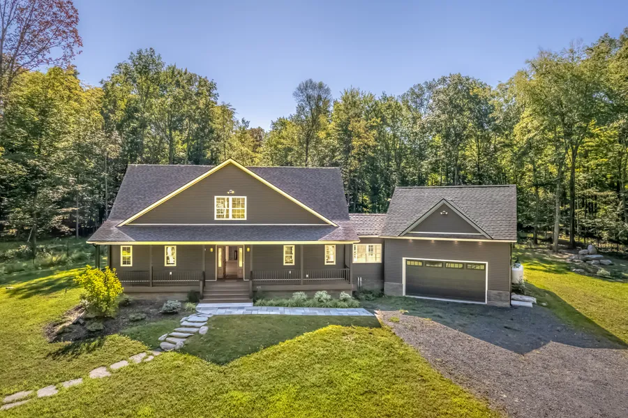 Tucked away in a peaceful country setting yet just minutes from some of the Hudson Valley's most beloved destinations, this thoughtfully designed home offers the perfect balance of luxury, comfort, and sustainability. A light-filled open floor plan showcases soaring ceilings and a beautiful stone fireplace that anchors the living space. Walls of windows bring the outdoors in, seamlessly connecting the interior with its natural surroundings. An elegant chef's kitchen featuring custom cabinetry, high-end appliances, a generous center island, and a wine bar—is ideal for both everyday living and entertaining. First-floor primary bedroom, complete with an en-suite bath, walk-in closet, and private porch access. Upstairs, two additional bedrooms, a full bath, and family room provide inviting accommodations for guests or quiet relaxation. Practical details, such as a breezeway-connected two-car...