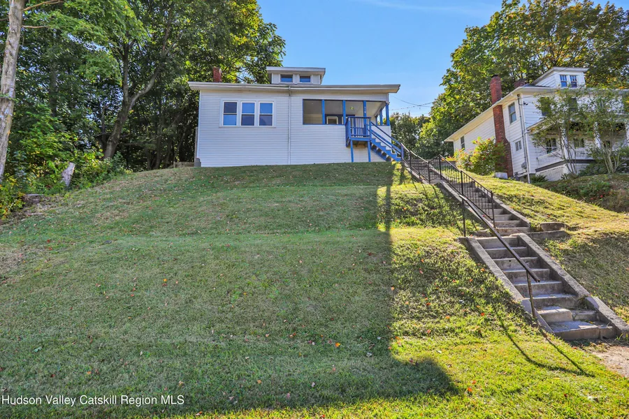 Centrally located and perched on a hill, this well-maintained Cape offers three bedrooms and two full baths. The open, light-filled floor plan highlights elevated seasonal views, with a welcoming sunroom that leads into the spacious living and dining areas-perfect for gatherings or everyday living. The dining room flows seamlessly into a large kitchen with newer cabinetry, a pantry, and stainless-steel appliances. Off the kitchen, a convenient mudroom with washer and dryer opens directly to an oversized deck, ideal for outdoor dining and relaxation. Upstairs, two generously sized bedrooms with ample closets are connected by a Jack-and-Jill bathroom. The unfinished basement provides additional storage, while outside you'll find off-street parking and a detached garage-currently set up as home office with extra storage. All of this just minutes from Uptown Kingston's Historic Stockade District, the downtown waterfront, rail trail, farmers market, and restaurants. Only 20 minutes to Saugerties and Woodstock, and under two hours to NYC, come take a look! **Recent updates: Gas hot water heater installed within the last 5 months, furnace serviced 2 years ago, roof approximately 15 years old, The interior and exterior decks have been freshly painted throughout * Please note property has a shared driveway *