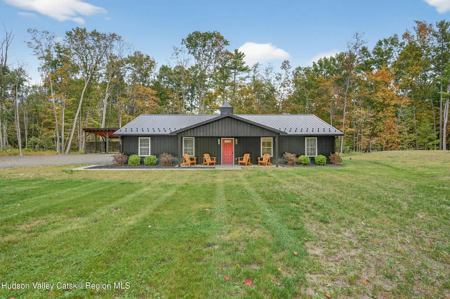 Introducing the Black and Gold Barndo at Hemlock Hollows! Tucked away at the end of a well-maintained private road, features this 1,260 sqft 2-bedroom 2-bath home on 4.5 secluded acres. Surrounded by nature and wildlife, this double primary, single level open floor plan, boasts a 4-car garage, a large work from home office and modernized attributes. Ideal for hosting, this newly constructed and gently-used home features a large kitchen with quartz countertops, Z-Line appliances, including a six-lite propane stove and plenty of room to spread out and enjoy your weekend company. A lovely accent wall with built in shelves, electric fireplace and a live edge cherry mantle hand selected from the land during construction, ties the main living area together. The main primary suite is a statement on its own, with a large accent wall, double closets and an enormous spa like walk-in tile shower. Platinum radiant heated concrete floors flow through the house giving off a comfortable warmth through the chilly winter nights. Cooper-Hunter ductless mini-splits provide air conditioning and additional heat if needed. Looking for room to expand? The attached 4-car garage equipped with electric car charging capabilities, is fully finished and offers 960 square feet of additional room for enhancing the living space whether it is adding another bedroom or making an art-studio or home gym. Outside find an expansive yard for gardening, a large car port and room for a pool (with proper permitting). The car port can also be blank canvas for a pool house, additional ADU (with proper permitting) or simply just storage. Lastly, don't look past the Generac stand-by generator equipped to power the whole house. Conveniently located at the foothills of the Minnewaska Preserve this location offers easy access to world class hiking along with local breweries, Inness Resort and Spa and everything else the Hudson Valley has to offer. Come and take a look at this gently lived in, well maintained and cared for home. Once you arrive you will not want to leave!
