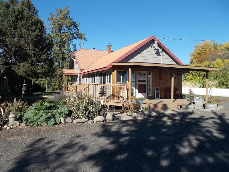 This is a delightful acreage with water rights, lots of outbuildings, including barn, detached garage, and shop. The property has a circular drive with lots of trees adding privacy and shelter. The farmhouse is delightful with 4 bedrooms and 2 baths. A property with alot of character- all you need is a swing and you have Swiss Family Robinson.