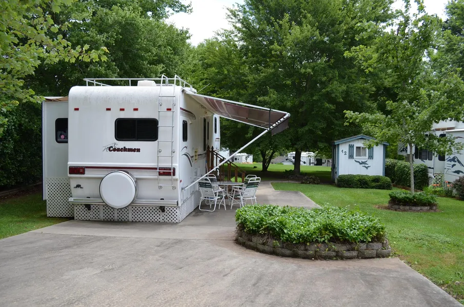 1997 Coachman w/2 slide-outs in well established RV community. Large concrete drive can accommodate 4 vehicles. Open layout, great kitchen w/dbl sink and side by side ref/freezer. Full sized shower, extra cabinets, central air, surround system. Wind-up TV antenna in BR area, TV and VCR, Combo-Matic W/D unit. New 24' awning. Concrete slab for additional shed. Annual fee includes common area mowing, use of pool and club-house, sewer, laundromat, garbage pickup.