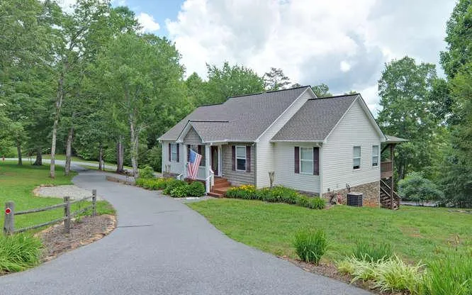 Lake Access Beauty. This home offers a wonderful open floor plan with lots of doors and windows to let nature in. High Cathedral ceilings grace the Great Room and Master Suite. Granite counter tops in kitchen, Large closets, Laundry room on the main floor. Covered viewing porches with large sliding doors. Finished lower level offers a drive under, oversized garage,Ample workshop area and storage, BIG den with showcase shelves, BR and BA. Low maintenance vinyl siding and stone on the exterior. Storage shed and Boat Parking too. Circular drive, landscaped yard and fire pit. Private boat ramp for residents. Home can be purchased via ASSUMABLE VA LOAN!!