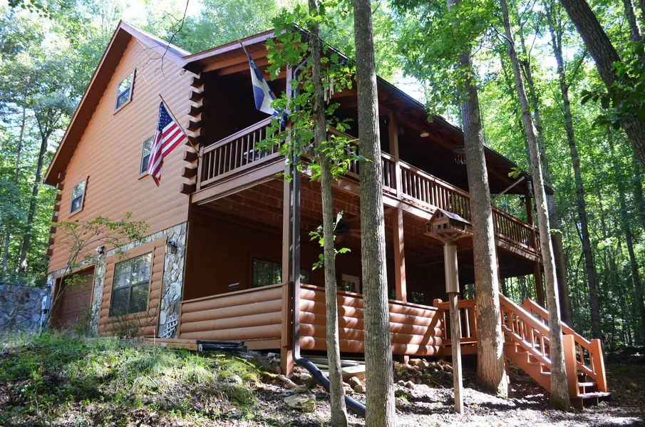 AUTHENTIC D-LOG CABIN! 1.92 acres of Woods and small branch runs along the back deck. Tremendous package includes a detached 2 car garage (24x30). An additional workshop is convenient to the home and shares wonderful decks. PRIVATE woodland Setting. The house offers 3BRs plus an Office-Laundry room on the main floor. High Cathedral ceilings w/ gas log fplc / rock face. Wood interior with hints of sheetrock in the bedrooms. Solid surface counter in kitchen. One car drive under garage in lower level plus Den. The half bath has room for a shower or tub. County water and underground power. Multiple entertaining decks and porches. Located close to Lake Nottely and convenient to Blairsville or Murphy