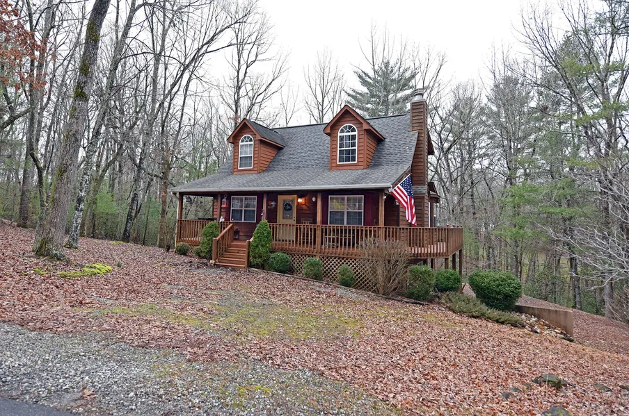 Simple Mountain Living. This delightful cabin styled home offers 3BR/3BA plus loft. 2 Master suites! Open great room w/ a mix of sheetrock & wood. gas log fplc, bayed dining area, wood floors, Open Loft w/ Antique built in stained glass Windows. Lots of Light. Furnished!!! Laundry on the main floor. Private screened porch w/ wrap deck to front covered porch. Drive under 1 car garage. Lower level has a finished bedroom, bath plus workshop space. Room for expansion! Lower patio. multilevel parking. Gravel circular drive. Approx 7 miles to town. Close to Lake Nottely. Development with just a few homes.