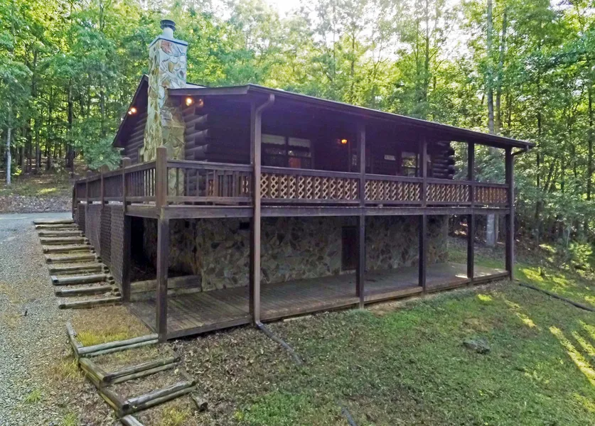 LOG CABIN on 2.62 Private wooded acres in an Established community. This home offers 2 BRs, 1.5 baths, wood floors, simple plan for easy cleaning and maintenance. Gas Log fplc in greatroom. Detached carport w/ concrete pad PLUS storage room. Roof 2006, Windows 2008, HVAC serviced. One level living. Full length porch across the front of the home. Stone faced foundation. Private gravel drive cuts through to 2 roads for easy Access for toys, boat trailers, RVs, etc. Lots of Wildlife. Convenient to Lake Nottely, Blairsville, and NC.