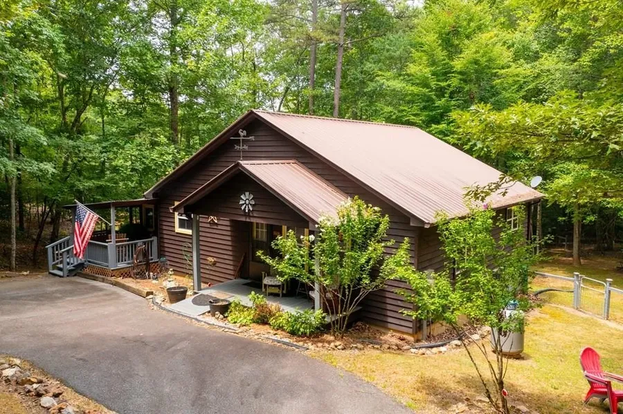 EASY ACCESS, ONE LEVEL LIVING in the North Georgia Mountains! Welcome to this charming Ranch Cabin located in Lance Crossing, offering the perfect blend of comfort and tranquility on a single level. This 2-bedroom, 2-bathroom home is set on 1.5+ acres, embracing natural beauty and modern amenities. Key Features include an open floor plan with a great room with a vaulted ceiling & a striking blend of sheetrock and wood, highlighted by a stunning gas log fireplace, a stylish kitchen that boasts beautiful Wormy Maple cabinets with granite countertops, and generous cabinet space, spacious sunroom & decks that provide ample space to enjoy the peaceful natural surroundings, a landscaped yard with ferns and a babbling creek running through the property offer a serene retreat. Plus some practical additions including a fenced yard, enclosed shed for lawn equipment, open shed for tools, and an asphalt circular drive with a metal carport. Situated in an excellent subdivision with county-paved roads, public water, and sensible restrictions, ensuring a well-maintained environment. Experience an abundance of wildlife in this idyllic setting. This home offers a perfect blend of rustic charm and modern conveniences, making it an ideal retreat in the North Georgia Mountains.