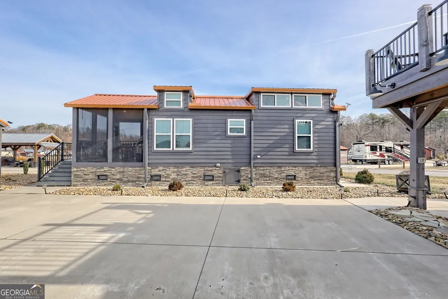 What more could you ask for? This meticulously maintained tiny home with a loft is as close to flawless as it gets. Designed for comfort, entertaining, and effortless living, the home features a striking tin roof with copper tones, concrete siding, stone accents, and a poured concrete driveway with full RV hookups-easily accommodating even the largest rigs. Inside, you'll find a generous living area, a master suite on the main level, and a loft perfect for a kids' bedroom or playroom. The well-appointed kitchen boasts full-size, high-quality appliances, quartz countertops, and an Eemax tankless water heater for endless hot water. Sustainable engineered wood flooring runs throughout, adding warmth and durability. French doors open to a relaxing screened front porch with custom screen door, while outdoor living truly shines with a stargazer double deck, open and covered dry decking, and a ...