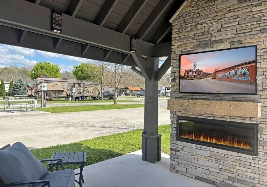 Discover the ultimate outdoor oasis with this exceptional lot that promises an unparalleled RV lifestyle! Envision your retreat with many conveniences finished for you: completed concrete work, with water and power lines already in place. This property features a versatile, insulated shed, perfect for storing your golf cart or creating a cozy retreat for the kids. There's more... At the heart of this lot is a stunning pavilion, designed with style and functionality in mind and elegant lighting that sets the perfect mood for evening gatherings. Picture yourself unwinding by the beautifully crafted stacked stone fireplace, watching your favorite shows on the TV while soaking in the breathtaking mountain views. But that's not all! The owner has thoughtfully prepared a space for a bar area, with cabinets and countertops ready for installation. For an additional $10,000, you can add custom cabinetry and countertops before closing, making this space ideal for entertaining or relaxing with friends and family. This is not just a lot; it's part of the RV lifestyle waiting to be embraced at our mountain destination in Blairsville, Georgia. Don't miss your chance to own the most astonishing lot on the block—where memories are made and tranquility reigns supreme! The property is nestled within the picturesque Georgia Mountains at Crossing Creeks RV Resort and Spa, a luxurious retreat on over 60+ acres of beautiful landscape. Immerse yourself in nature's tranquility, surrounded by the beauty of Coosa and Anderson Creeks. This lot is more than just a property; it's an invitation to embrace a serene lifestyle in one of North Georgia's finest RV communities. Enjoy amenities such as a fitness center, pools, a dog park, Pickleball courts, a community center, and much more. Your dream getaway awaits!