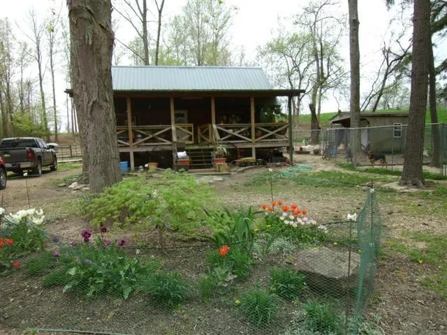 Picturesque log cabin set in pines trees.Built in 2004 on 5 acres with pole building. Open porch on front and back. Also has a creek running though property. Close to winerys and Shawnee forest to hike or ride your horses. Outside dogs.
