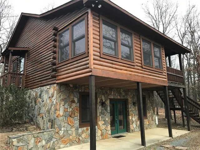Enjoy the views of your private pond from the open great room, sun room, deck, bottom level and patio from this very unique log/stone/block home. Upper level has open great room, kitchen and dining area. Master bedroom has exposed logs on exterior walls and walk in closet. Rustic looking full bath. Basement has open bonus room that is used as bedroom/sitting area plus full bath and laundry room combo. Basement also has a huge walk in closet plus additional closet. Fenced area for your animals. Large storage building. Well worth viewing.