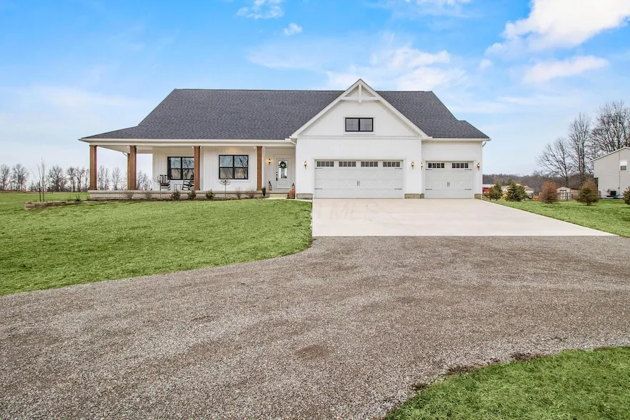 This exceptional custom-built luxury ranch offers a rare opportunity to own a nearly new, highly upgraded home priced below its total build cost. Constructed in 2024 with meticulous attention to detail, the total investment into the home, site work, and premium upgrades exceeds $875,000, making the current list price an outstanding value. Set on 4.67 private acres, the property features extensive site improvements including a professionally installed driveway, well, septic system, propane gas line, concrete garage apron, and walkways. Inside, the home showcases over 2,100 square feet of refined single-level living with 11' ceilings, transom windows, upgraded lighting, and waterproof luxury vinyl plank flooring throughout with no transitions. The chef's kitchen is anchored by upgraded cabinetry, granite island with farmhouse sink, custom pantry with shelving, wall oven and microwave combo, and high-end appliances designed for both beauty and functionality. The open living space flows seamlessly to the covered rear porch overlooking a saltwater fiberglass pool, stamped concrete patio, professional landscaping, sod, and a 5' metal fence, creating a true private retreat. The primary suite offers a spa-inspired bath with custom tile shower, dual walk-in closets with organizers, added window, and elevated finishes. Additional highlights include a 3-car garage with drywall, paint, and 240-volt EV charging, upgraded basement features with dual sump pumps and advanced filtration system, rough plumbing in the basement for a half bath, custom tile in guest bath, upgraded hardware throughout, and included Samsung washer and gas dryer. Conveniently located near Honda and Scotts, this home delivers the perfect balance of luxury, privacy, and proximity to major employers without the wait or rising costs of new construction.