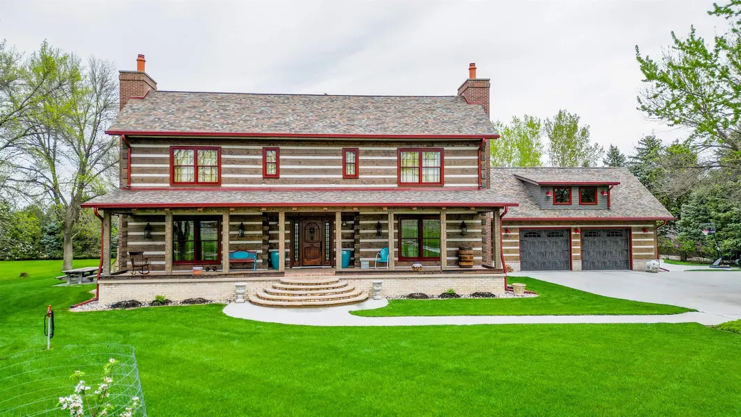 One of a kind, gorgeous, Stone Mill Oregon hand hewn timber home on acreage adjacent to Dakota Dunes. 5,366 total sq ft, 4 bdrm, 4.5 bath, 5 fireplaces. Bonus of fabulous Post and Beam Barn w\720 sq ft studio loft and electric fireplace, plus main floor garage w\ 1656 sq ft. and 1\2 bath. This custom home has every detail covered and desire met. From the front porch w\ custom train rail border, this home has "detail" with a capital "D". As you enter through the custom front door unto the hand selected tile, you are stepping into shear pride of ownership. The great room displays the custom designed jaw dropping staircase with hand selected pieces for treads and railing, which overlooks the 20 ft vaulted timber ceiling and Rumsford fireplace w\Chiefcliff stone, pot crain w\ matching exterior fireplace on 552 sq ft back covered porch. This home has 4 bdrm, 4.5 baths, 4 gorgeous fireplaces (2 gas\2 woodburning), hickory hardwood floors throughout, tile baths, sitting\formal dining room, private library, open kitchen with granite tops, custom cabinetry, wlk~in pantry, farm sink and pot filler, awesome appliances. The main floor includes primary suite w\ copper accented gas fireplace, tiled ensuite w\ copper soaking tub and walk~in tile shower with custom tiles and walk~in closet. The second floor boasts the hickory floors, 2 bedrooms each with private 3\4 tile baths. Perfect for guests or a quiet spot to take a nap. Lower level has another gorgeous custom staircase and iron rail, polished concrete floors, reclaimed wood finishes, wetbar with copper sink, bedroom, 3\4 bath and safe room. All setting on sprinkled yard, with apple and peach trees, see docs tab for more details..