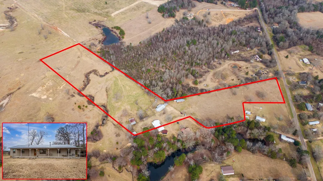 14.92 East Texas Acres with 3-bedroom, 2-bath ranch style home. Home boasts 1800 square feet of living area with covered porches. Property comes complete with metal building workshop with RV cover, vintage wood livestock barn with wood corrals, a horse barn and tack storage building all overlooking the scenic views of a live creek and the rolling hills of East Texas. Property also has ample room to add additional housing if so desired. Seller is reserving minerals.