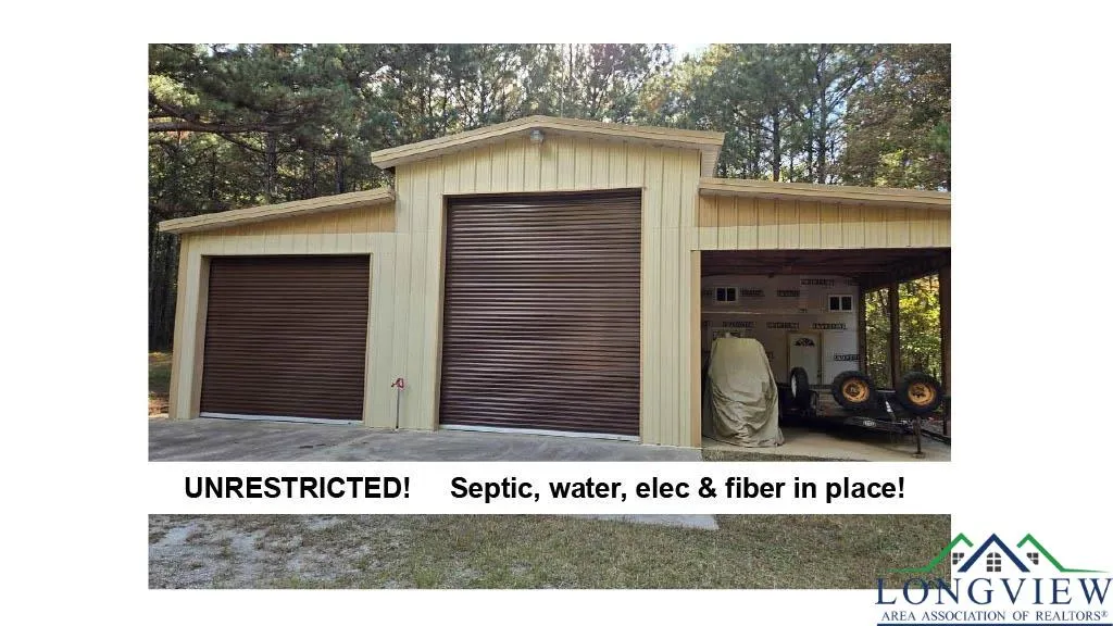 FIVE ACRES UNRESTRICTED - Utilities in Place - Mobile Homes Allowed! This gated 5 acres has it all, including 3 RV hookups (2 inside, 1 outside). Septic, water, electric and fiber internet are available in the building - move in your RV the day you close. All the work has been done and there are no restrictions. The 1,400 sq. ft. building features large, roll up doors for easily storing your RV. A full bathroom is roughed in and ready for your finishing touches. With everything in place, you can easily convert the building into a stunning barndominium, a charming guest house, or enjoy as a large workshop. The long, winding driveway, just past the private gate, offers total seclusion. This five-acre property is ready for you to create your dream homestead, small RV park, or country getaway. Located minutes from town and outside city limits, enjoy total freedom in desirable Gilmer ISD.