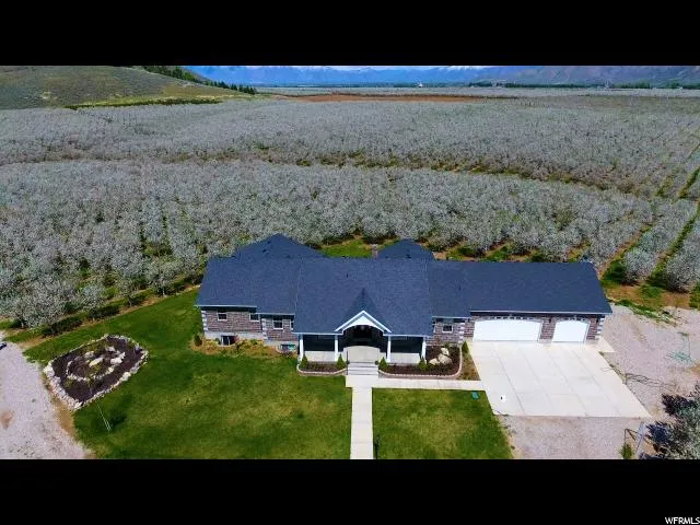 Incredible Santaquin property with 5.25 acres of beautiful cherry trees now available! This home boasts a large open floor plan, beautiful finishes, amazing views, and so much more. Kitchen features plenty of storage, walk in pantry, granite counter tops, tile backsplash, large bar, and stainless steel appliances. Open to the living room or large deck, this is the perfect space for entertaining. Living room features pot belly stove, vaulted ceilings and views for days out of enormous windows! Basement is partially finished with large living area, workout room, kid cave, and walks out onto lovely patio. Plenty of room for three additional bedrooms and two additional bathrooms. Three car garage is over sized with plenty of storage. Ample parking surrounding home, perfect for guests or RV and toy storage. Surround yourself with cherry blossoms and incredible mountain views in this one of a kind property!