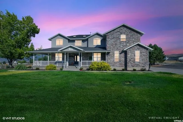 Horse Property with a 3,750 sq. ft. outbuilding (50 ft. X 75 ft.) with 4 garage doors total 3 that are 12 feet tall, one 8 foot tall and a man door. Outbuilding also has running hot and cold water, has half bathroom, 240 V, gas line has been ran under ground on the east side, trailer dump and 4 skylights. This property can be used for livestock, agriculture, business use, a lot of possibilities. House is very well maintained, only had one owner that built everything custom. Large master suite upstairs 800 sq. ft. total. Gazebo has electric, water and gas ran to it. Firepit in the back also has electric and water ran. There has also been electric wire ran out to the road for future lights. Great view of Utah Lake and surrounding mountains. There is a gas line ran to master bedroom for a future fireplace between bedroom and master bath. Private well on property runs all water, (not connected to city water) with water pump that pumps 50 Gal/minute, Property is currently zoned residential, but may be re-zoned as a Greenbelt with a possibly lower tax rate. Square footage figures are provided as a courtesy estimate only and were obtained from property owner. Buyer is advised to obtain an independent measurement.