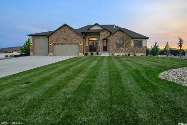 Stunning surround mountain views also views of Utah Lake with over an acre. The kitchen flows into the great room with vaulted ceilings, high ceilings throughout the entire home. Granite and quartz counter tops in all kitchen, laundry and baths. Main level master bedroom with fire place and bath are absolutely gorgeous, jetted tub and very large shower. Four sets of French doors leading to all decks and patio. Basement has 9 ft. ceilings, two family rooms, second kitchen, 2 additional bedrooms and a second master suite. Loafing shed and corral for horses with 12x30 shed for tack and hay, lawn mowers, tools, etc. Enclosed backyard with Vinyl/ Black iron fencing, 3 gates, large inclosed garden. Extensive rock work and landscaping with over 30 trees. Extra long heated garage bay with custom built cupboards, large sink and work bench. Square footage figures are provided as a courtesy estimate only and were obtained from County Records . Buyer is advised to obtain an independent measurement.