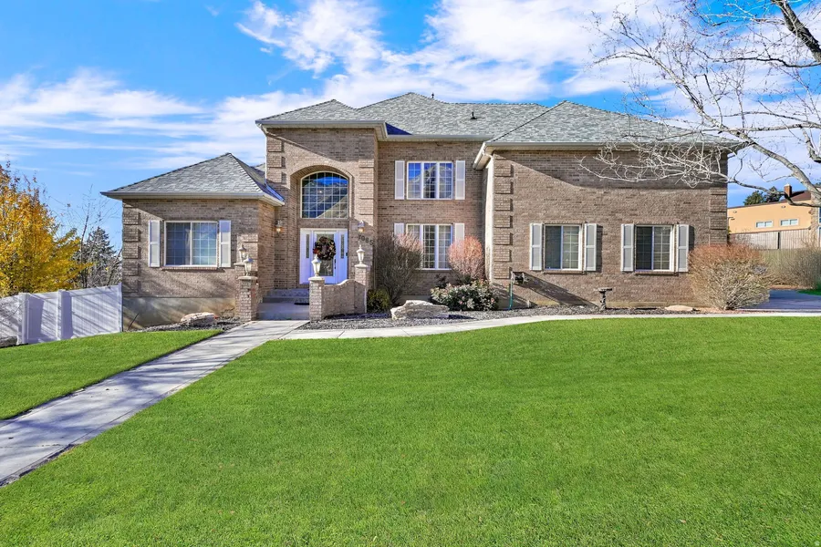 This custom-built, all-brick home commands "million-dollar views" of the valley, mountains, and Utah Lake that are truly few and far between. Uniquely, this sale includes an adjoining, fully improved second lot to the north, providing ample space to accommodate all your recreational needs, including boats, RVs, toy trailers or even a second dwelling. Step inside to a show-stopping entry featuring soaring 20-foot vaulted ceilings and a breathtaking chandelier equipped with a lift system. The exceptional floor plan is designed for main-floor living, highlighted by 12-foot ceilings throughout the main level and a formal living and dining area. At the heart of the home is an extra-large kitchen with custom oak cabinetry bar seating, and a spacious eating area. The main floor master suite is a true retreat, boasting a jetted tub and French doors that open onto a Trex deck, offering romantic sunset views overlooking the lake. This home is uniquely designed with master suites on all three levels, offering incredible flexibility for multi-generational living. The upstairs features bedrooms connected by a Jack-and-Jill bathroom, along with a third large vaulted bedroom with its own private full bath. The 100% finished walk-out basement is a standout, featuring an additional master suite with a second jetted bath, separate shower, and two huge walk-in closets. Ideally suited for security and storage, one closet includes a hidden vault door for safekeeping. Outdoor entertaining is effortless on the ginormous Trex deck, which features gas access for a firepit and outdoor heaters. Below, a huge, stamped concrete patio invites you to enjoy the fully fenced yard and the majestic wildlife in your own backyard. Your mind will be at ease, because the home features a brand-new roof, two water heaters, a double furnace, and 220V wiring ready for a hot tub or electric vehicle. A spacious 3-car garage completes this perfect package.