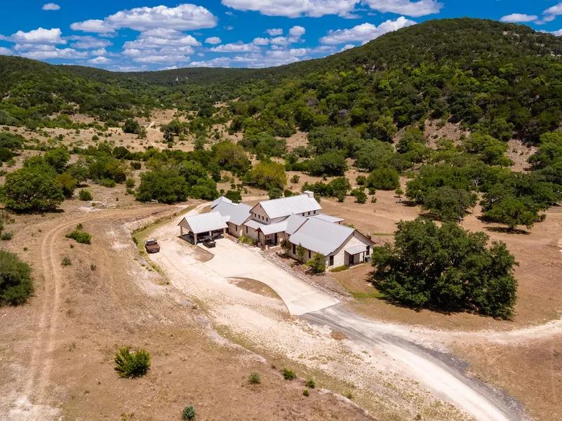 The Ranch offers a custom 4 Bedroom home built about a mile from the highway and neatly tucked away in a beautiful valley surrounded by hardwood lined hills. The beautiful limestone home features 4 bedrooms, 4.5 baths, 10 ft ceilings and 8ft doors throughout the house. The house features an open floor plan with a living room/ dining room/ kitchen combination. The great room includes towering 26 ft ceiling, hardwood floors, gas fireplace with windows and doors looking out onto aq deep wrap around porch. Also included, a large utility room with sink, refrigerator and freezer, washer and dryer. Walk in pantry, TV/ family room, small office/computer room, office area off kitchen, 3 AC units, outdoor kitchen, 24x24 ft Carport and 24 x 150 ft driveway with multiple parking areas.