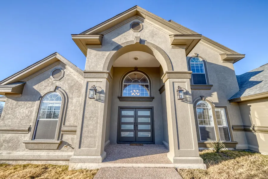 HIDDEN AT THE END OF A WINDING LANE, THIS STATELY CUSTOM HOME IS HIGH END IN EVERY WAY. A GATED DRIVE LEADS TO A MASSIVE CONTEMPORARY THREE PANEL FRONT DOOR AT THE ENTRANCE OF THE HOME. IN THE FOYER, THE CEILING SPANS TWO STORIES. THE LIVING ROOM, WITH A WALL OF WINDOWS INVITES YOU IN, AND THEN REVEALS WHAT IS BEYOND-A PATIO WITH A ROCK WALLED SWIMMING POOL AND COVERED OUTDOOR KITCHEN WITH BBQ PIT, DEEP FRYERS, REFRIGERATOR, AND TV. SITTING AREAS AND A HUGE FIREPIT FLANK THE AREA, AND THERE'S AN OUTDOOR HALF BATH TO ACCOMMODATE GUESTS. AN IMPRESSIVE GOURMET KITCHEN FEATURES A STAINLESS COOKTOP, DOUBLE OVENS, REFRIGERATOR, CUSTOM CABINETS, AND AN ISLAND WITH A BUILT IN ICEMAKER. ONE COUNTERTOP ALSO SERVES AS A BAR BETWEEN THE KITCHEN AND BREAKFAST NOOK. THE FORMAL DINING ROOM HAS PLENTY OF ROOM FOR A LARGE TABLE AND CHINA CABINET OR BUFFET. THE MASTER BEDROOM FEATURES TREY CEILING...
