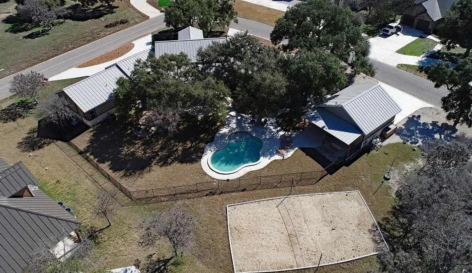 Towering heritage Live Oak trees shade the spacious fenced back yard, which is safety-gated and showcases a PebbleSheen Keith Zars Pool with a sundeck splash area. A picnic table and wrought iron tables & chairs offer outdoor meal seating for up to 26. The bonus Party Barn/Garage is outfitted with a top-quality regulation-size Ping Pong table, cold-drink refrigerator, additional seating, and ice chest & tube storage. Guests of all ages enjoy utilizing the sand volleyball court, tetherball and washer pitching equipment that is provided as well as a handy outdoor bath. Concrete pathways and patios connect all these backyard amenities and offer flexible entertaining and lounging options. Plenty of watching activities are also available, including bird watching, family watching and, after everything quiets down at night, the Double L offers a prime location for late-night stargazing - the handcrafted cedar porch swing.