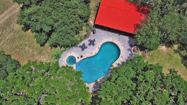 The Pool house has one queen, one double, two twins, and a full bath. There is a bar, a grilling area, and refrigerators on the porch of the pool house. The pool and hot tub area are surrounded by a large patio connecting all of the structures, and offering plenty of space to dine out and enjoy the beauty that the hill country has to offer.
