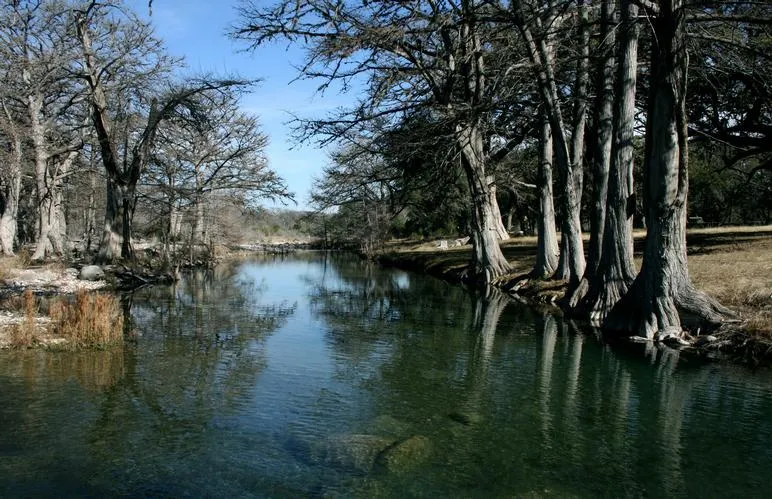 VEGETATION: Manicured lawn of native grasses lies under beautiful large pecan and oak trees that are scattered across the grounds. Ancient lacey cypress trees border the banks of the Frio River.