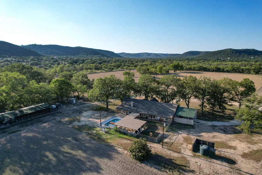The custom +/- 2620 sf home is located towards the middle of the property under a grove of huge pecan trees that provide shade at all hours of the day. There is also a brand new in ground pool and a covered entertainment area for cooking or relaxing with friends and family. A new 1200 sf barn on concrete slab with a 40 x 20 covered area on one side will provide all your storage needs. The property is also set up for horses. The front pasture is separately fenced and has a dirt track for riding or taking a spin on the golf cart or UTV. Near the house is a 4-stall horse shed, covered storage area and fenced in riding arena. The back pasture is also separately fenced and is loaded with mature pecan trees! The axis deer and whitetail love this area and hunting is allowed.