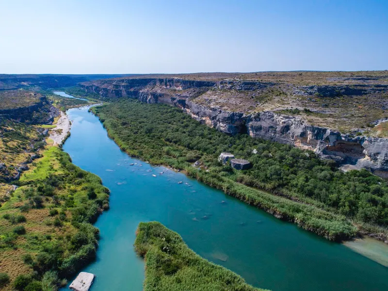 The river is characterized by steep, rugged cliffs that direct the flow of the rushing waters below. Craggy canyons carry runoff and tributaries to the river, increasing its flow as it moves downstream. The river averages 265 cubic feet per second of flow at Langtry. Alternating between deep water pools, fierce rapids, and sand-lined shores, this stretch of the Pecos is a popular destination for kayak and canoe trippers, and the Texas Monthly guidebook discusses several points of interest that fall within this property, including petroglyph-covered bluffs in Lewis Canyon, class three rapids, and Painted Canyon Rapids.