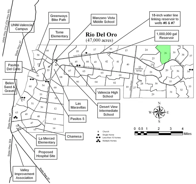 The main roads in the Rio Del Oro are the Manzano Expressway and the Rio Del Oro Loop. This planned community has these main roads designed for the movement of vehicles and not for shopping centers. Each subdivision unit has its own main roads and this is where the strip mall style shopping centers will be located. They are laid out and designed to be an integral part of the community, with the residential areas surrounding the commercial areas.