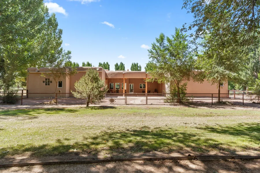 Experience the epitome of Southwestern living in this extraordinary home situated on nearly 3 acres of pristine land. This property is a true Equestrian estate, boasting a barn, green pastures, a delightful fruit tree orchard, and an unparalleled sense of privacy. As you step through the stunning entryway, you'll be captivated by the grandeur of the great room, offering panoramic views of the vibrant backyard. The open layout seamlessly connects the great room, dining room, and kitchen. The Chef's kitchen features custom cabinets, a 5-burner gas cooktop, and SS Appliances. Additionally, enjoy access to the neighborhood riding area, allowing you to explore the surrounding scenic trails and embrace the equestrian lifestyle to the fullest.