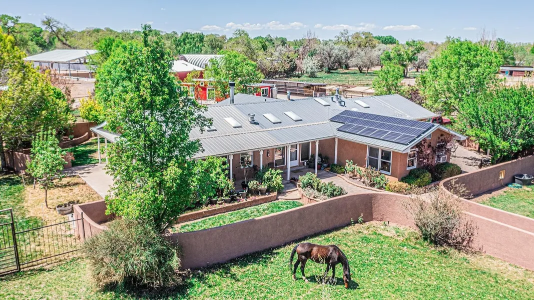 Turnkey equestrian dream! This incredible 4.7-acre property has it all. The front 2 acres feature a gorgeous 3-bed, 2-bath home with granite countertops, high-end appliances, and owned solar. Outside, enjoy two lush grass pastures, five run-in stalls, a mud-free loafing paddock, and a 750 sq ft multi-use building with water, electricity, A/C, and a bathroom. The adjoining 2.7 acres is built for serious horse lovers--boasting a 70x200 lit arena (half covered with drop-down walls), engineered sand footing, a massive 36x60 barn with 6 stalls, center aisle, tack room, and a 60 foot round pen with covered shade sails. Fully fenced with pipe and rail and easy access to Bosque trails and the Rio Grande. Ride, train, or could be a great wedding venue, covered BMX track. Endless possibilities