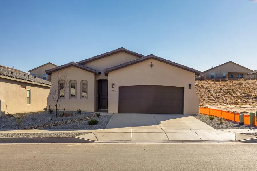 This beautiful Maya floor plan, located in the vibrant Mil Colores neighborhood within the Fiesta Master Planned community in Los Lunas, features a stylish design with upgraded amenities. This ranch-style home offers sleek, modern lighting, upgraded appliances, and refined interior finishes, including upgraded tile flooring, beautiful white and gray quartz countertops, and warm brown shaker cabinets. It includes 3 bedrooms, 2 bathrooms, and a generously sized backyard with endless possibilities for creating your own oasis.