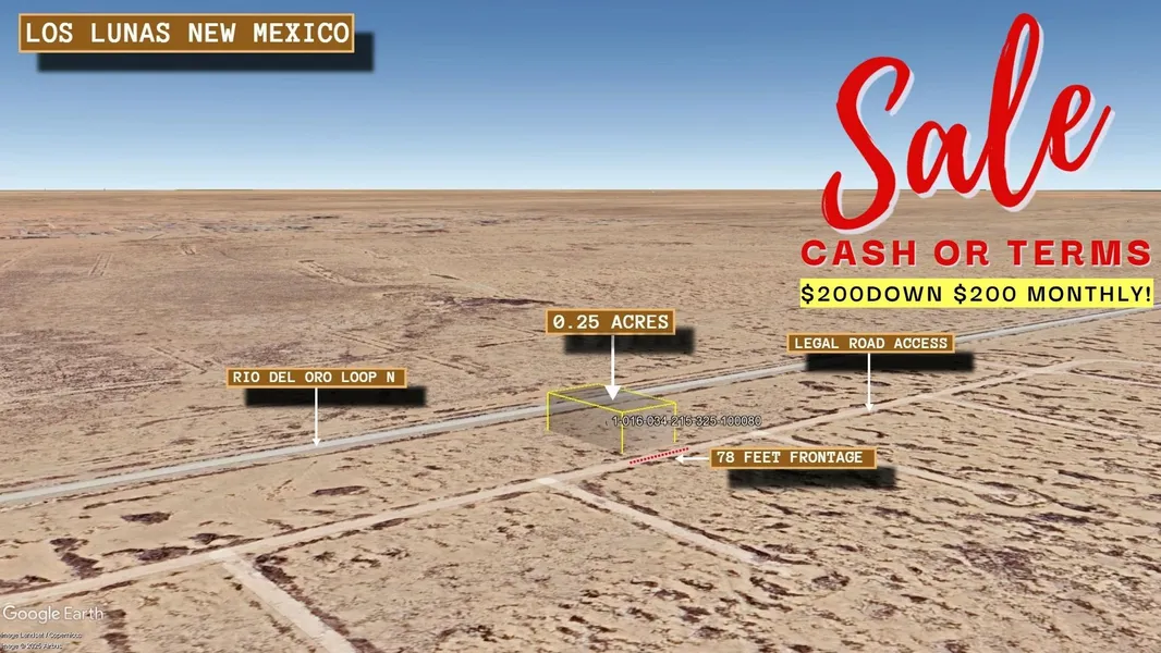 Discover the allure of the Southwest with this exceptional 0.25-acre lot in Valencia County, New Mexico. Priced affordably at $1,000, with a low down payment of $200 and manageable monthly payments of $200, this property offers an incredible opportunity to own land in a stunning location. While there are document stamp fees of $350, the overall cost remains remarkably accessible, making land ownership a realistic dream.