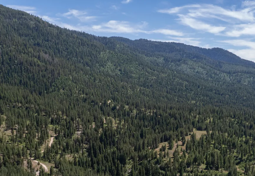 The lush green canopy of trees stretches as far as the eye can see, with a well-maintained dirt road winding through the landscape, providing easy access to various parts of the property. The forested area is ideal for hiking, wildlife observation, and enjoying the tranquility of the great outdoors. Additionally, the property borders Forest Service Land, giving this property a much larger feel and expanding your exploration and recreational opportunities.